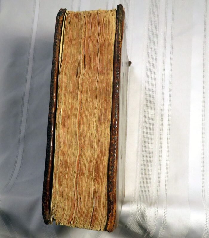 A rare 1683 King James Version combined with Geneva Bible notes from the 1599 edition and Theodore Beza. Contains almost 1000 pages with notes on the complete Bible ,making this a veritable library of study and classic Protestant commentary in just one book. These annotations which are an important part of the Geneva Bible were Calvinistic and Puritan in character, and as such ,they were disliked by the ruling conservative Protestants of the Church of England as well as King James I, who commissioned the Authorized Version or King James Bible to replace it. The Geneva Bible had also motivated the production of the Bishops’ Bible under Elizabeth I, for the same reason, and later the Douay- Rheims edition by the recusant Papists. The Geneva Bible remained popular among Puritans and was their beloved translation of choice in use until after the English Civil War. The final 17th century printing was completed in 1644 in Amsterdam with the preceding 1640 edition being the first that deliberately omitted the Apocrypha. The Geneva notes were first included in an edition of the King James Bible in 1642 and printed in subsequent editions as late as 1715.