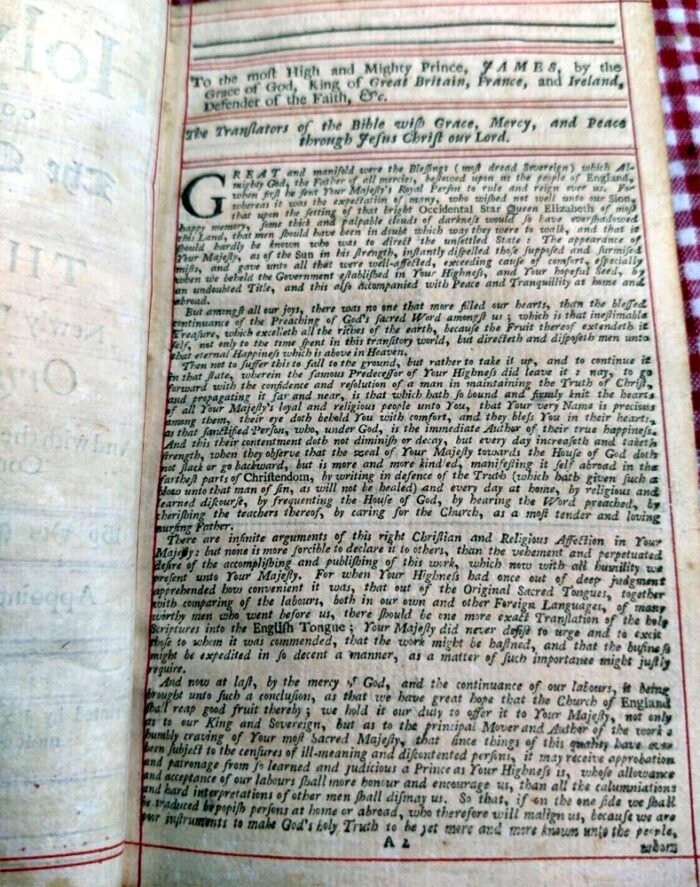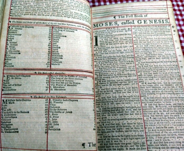 Title Page reads: “The Holy Bible Containing the Old Testament and The New: Newly translated out of the Original Tongues. Thomas And Clarke. With the former Translations diligently conpar’d & revis’d By his Ma(ts) Special Command Appointed to be read in Churches London Printed by the Afsigns of Thomas Newcomb, and Henry Hills, deceas’d, Printers to the Queens most Excellent Majesty 1711.”