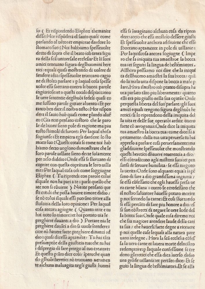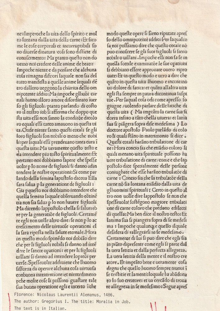 Ecclesiastical incunable manuscript page, Moralia Sopra La Vita Di Job, by Pontifus Maximus Gregorius I, printed by Nicolaus Laurentii, Florence, 1486